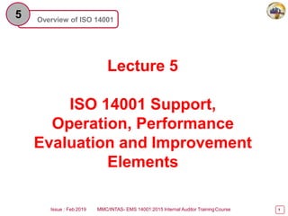 The document provides an overview of ISO 14001:2015, focusing on key elements such as support, operation, performance evaluation, and improvement required for effective environmental management systems (EMS). It outlines concepts including resource management, competence, awareness, communication, operational planning, emergency preparedness, and performance evaluation processes, emphasizing the need for documentation and compliance. The emphasis is also placed on internal audits and management reviews to ensure continual improvement of the EMS.