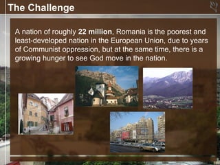 Jake and Jessie Stimpson feel called to serve as missionaries in Romania. Their goals are to preach the gospel, make disciples, train leaders, and establish churches in Bucharest and throughout Romania. They will focus on reaching students and young adults in Bucharest to help spread the gospel throughout the country. Romania has many spiritual and physical needs, and the Stimpsons are committed to transforming the nation for God's glory through evangelism, discipleship, and church planting. They are asking for prayer, financial support, and help spreading their vision to reach Romania with the gospel.