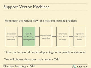 The document discusses Support Vector Machines (SVM) in machine learning, emphasizing their capabilities for linear and nonlinear classification, regression, and outlier detection, particularly suited for small to medium datasets. It outlines the process of training and testing SVM models, the importance of feature scaling, and differences between hard and soft margin classifications. Examples include various classification types, such as binary, multi-class, and multi-label, illustrated using datasets like the Iris dataset.