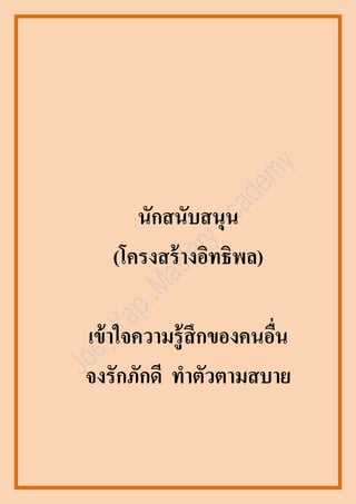 สึกของคนอืน” ่ คนโครงสร้างอิทธิ พลไม่ใช่คนไร้หวใจ โหดเหี้ ยม และชอบแก่งแย่งแข่งขันประเภทที่ตอง ั ้ กาจัดทุกคนให้พนทาง แท้จริ งนั้นเพราะการขาดความได้เปรี ยบในการแข่งขัน พวกเขาจึงมักคานึ ง ้ และคิดถึงคนอื่น และให้ความสาคัญแก่ประโยชน์ของคนอื่นเหนื อกว่าของตัวเอง ด้วยเหตุน้ ี ผคนจึง ู้ พบว่าพวกเขาเป็ นคนประเภทที่คานึงถึงคนอื่น และอ่อนไหวต่อความต้องการของคนอื่น ในสภาพแวดล้อมแห่ งการแข่งขัน คนโครงสร้างอิทธิ พลระมัดระวังอย่างยิ่งที่จะไม่ทาร้าย ความรู ้ สึกของคนอื่น หรื อไม่ทาให้คนอื่นรู้ สึก ด้อยกว่าหรื อไร้ คุณค่าในทางใดๆ ทั้งสิ้ น แบบนั้น ไม่ใช่สไตล์ของพวกเขาเลย ด้วยเหตุน้ ี พวกเขาจึงมักปล่อยให้คนอื่นชนะหรื อแซงหน้าไปเพื่อรักษา มิตรภาพหรื อความสัมพันธ์ทางอาชีพการงาน คนโครงสร้างอิทธิ พลยึดคนเป็ นศูนย์กลาง สภาพแวดล้อมแห่ งการทางานที่ดีสาหรับพวก เขาคือที่ที่ผคนรู ้สึกมันคง มีความสุ ข และพึงพอใจ ไม่ใช่ที่ทุกคนรู ้สึกกระสับกระส่ าย ไม่มนคง และ ู้ ั่ ่ พร้อมที่จะต่อสู ้ทาลายกัน ฟังดูอาจเหมือนความปรารถนาธรรมดาๆ แต่ก็มีผคนมากมายที่ไปได้ดีใน ู้ สภาพแวดล้อมที่เต็มไปด้วยอัตตาที่เปราะบางและความรู ้สึกเจ็บซ้ า ทว่าคนโครงสร้างอิทธิ พลไม่ใช่ หนึ่งในคนพวกนั้น ดังนั้นจึงมักได้รับการจดจาหรื อระลึกถึงว่าเป็ นคนใจดีและช่างคิด ข้ อเท็จจริงสาคัญ ห่วงใยใส่ ใจ มีทศนคติที่ให้ความสาคัญแก่คนก่อน ั ไม่ชอบทาร้ายความรู ้สึกของคนอื่น ไม่เห็นแก่ตว ั