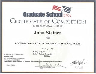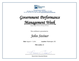 John Steiner attended the Government Performance Management Week course from August 4-7, 2014 in Washington DC. The course provided 24 professional development unit credits. Steiner also received certificates for attending a Risk Management Knowledge Area Meeting on July 9, 2014 and was awarded 1 continuous learning point.