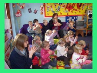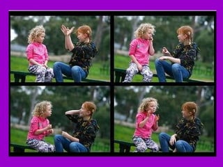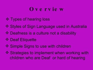 The document discusses deafness and sign language. It covers types of hearing loss, styles of sign language used in Australia, deafness as a culture rather than a disability, etiquette when working with deaf individuals, basic signs to use with children, and strategies for working with deaf or hard of hearing children. These include maintaining eye contact, reducing background noise, repeating information in different ways, and using visual cues and sign language. The goal is to provide an understanding of deafness and communication strategies when working with deaf children.