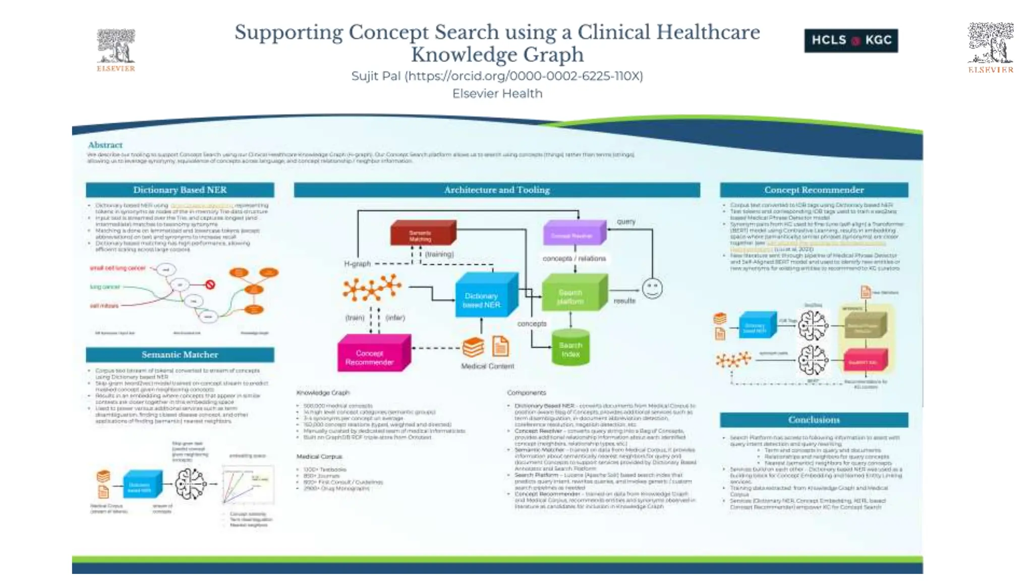 The document discusses a healthcare and life sciences symposium that focuses on leveraging a clinical healthcare knowledge graph to support concept search through named entity recognition and linking. It describes the extensive resources available, including 500k curated concepts, various semantic categories, and a search platform utilizing advanced NLP techniques for improved recall and semantic matching. Additionally, it highlights the use of embeddings and a concept recommender system to enhance search accuracy and efficiency.