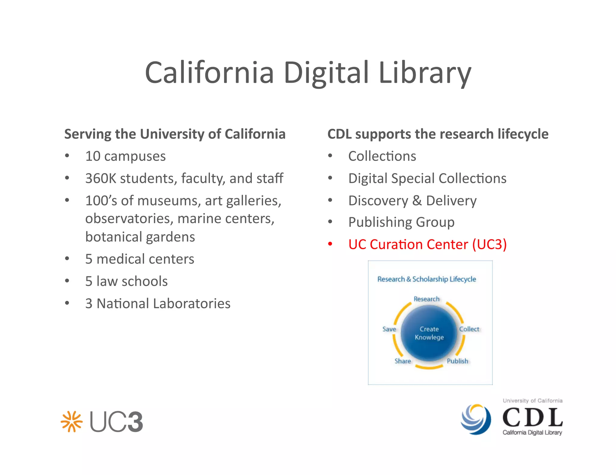 The document discusses data curation services provided by the California Digital Library (CDL). It describes CDL's Merritt repository for stable storage, EZID for assigning persistent identifiers, DMPTool for creating data management plans, and tools for data discovery, citation, and preservation cost modeling. CDL supports the full data lifecycle from deposition to long-term curation and access. The document outlines how CDL's services have expanded over time to meet the growing needs of data producers and a changing technological landscape.