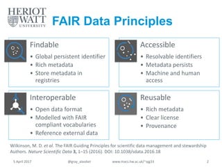 The document outlines FAIR data principles in the life sciences, emphasizing the importance of making datasets Findable, Accessible, Interoperable, and Reusable (FAIR). It discusses challenges in data reuse, the complexities of dataset descriptions, and provides guidelines for creating metadata that adheres to these principles. Additionally, it introduces tools like the Open Phacts Validator and highlights specific metadata specifications for enhancing data discovery and usability.