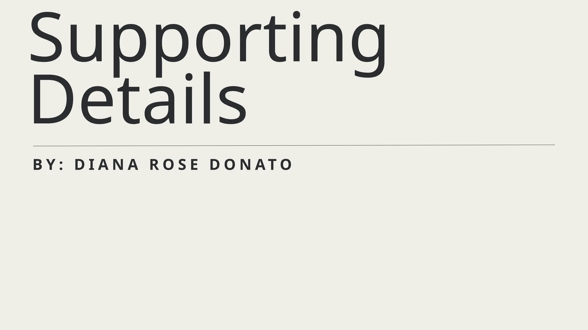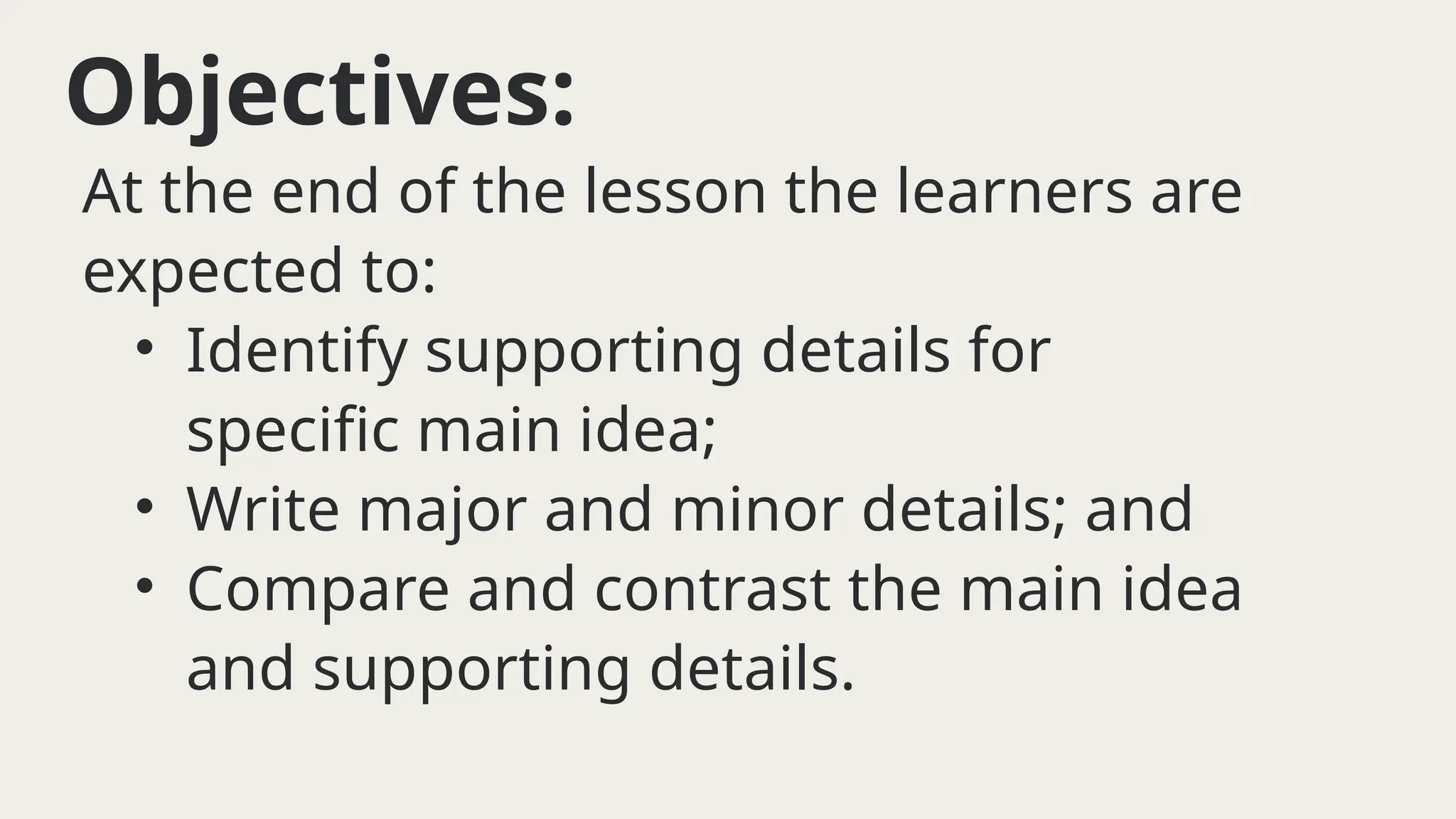 The document outlines educational objectives focusing on identifying, writing, and comparing main ideas and supporting details in writing. It describes types of supporting details—major and minor—and provides steps for finding them. Additionally, it includes instruction for students to practice these skills through specific writing tasks and a short quiz.