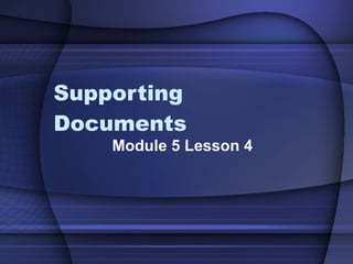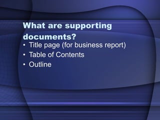 This document discusses different supporting documents that can be included with a business report, including a title page, table of contents, and outline. A title page for a business report should include the report title, author's name, and date centered on the page. An outline organizes information in a numbered list format using Roman numerals for main entries and letters and numbers for secondary entries. A table of contents lists the headings and subheadings of a report along with their corresponding page numbers.