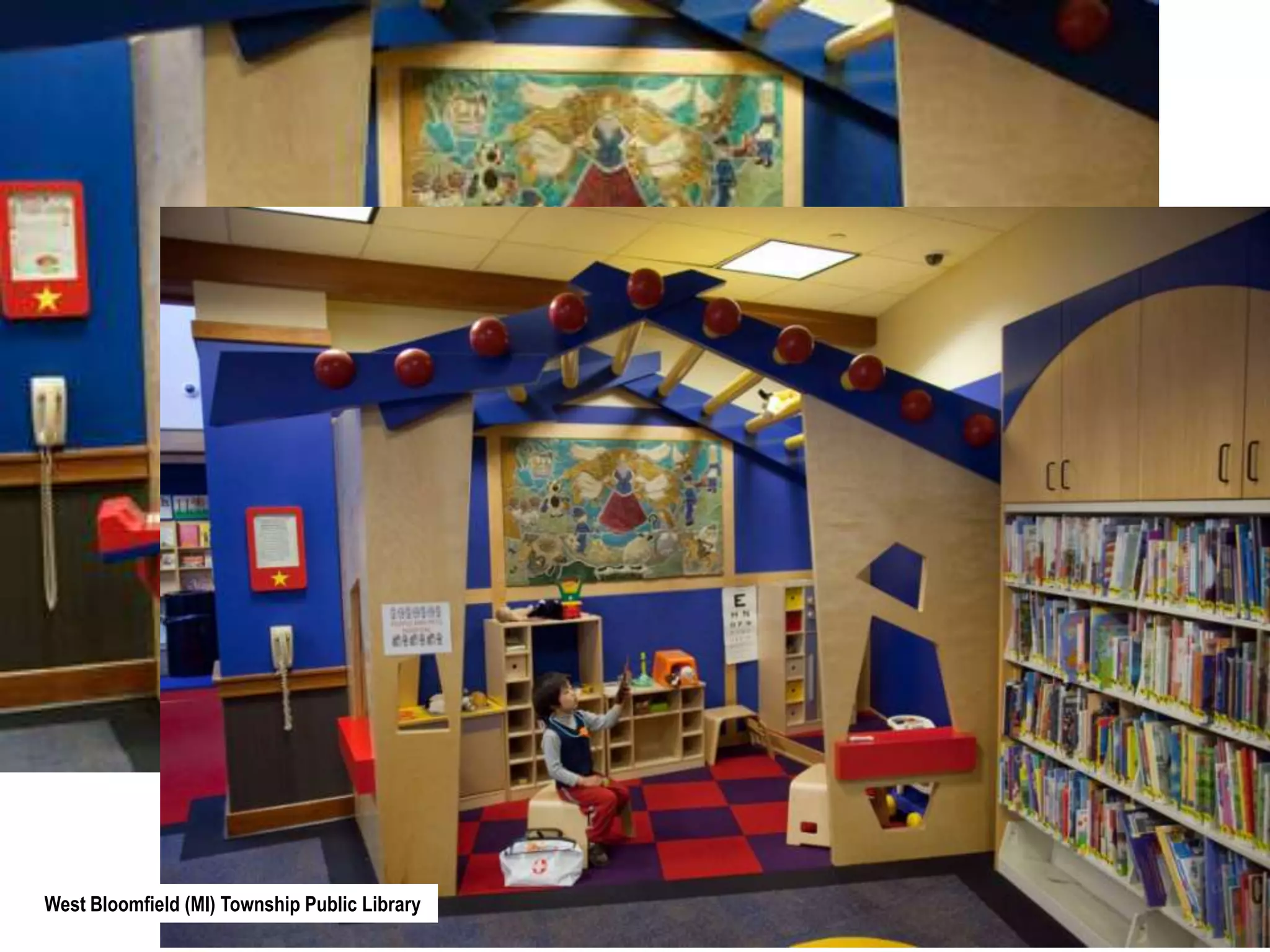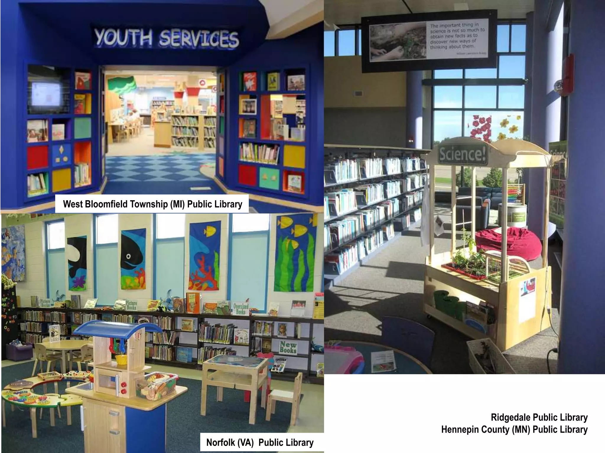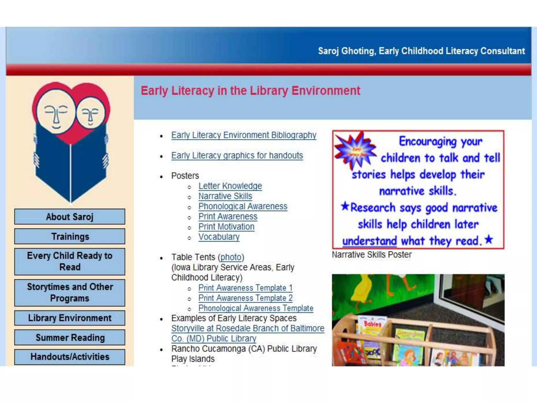 This document provides an overview of strategies for creating language-rich library environments that support early literacy. It discusses the components of such environments, including affective, design, personal, content, physical, and informational aspects. Examples are given of specific libraries that have implemented language-rich spaces through features like early literacy centers, activity areas, signage explaining concepts, and branded spaces. Considerations for creating these environments involve change management, mobility, storage, and emphasis on writing. Current trends include outdoor spaces, addressing multiple school readiness domains, and building infrastructure as environment.