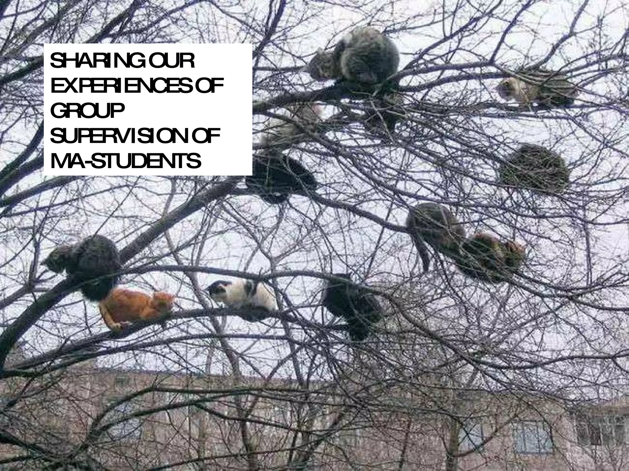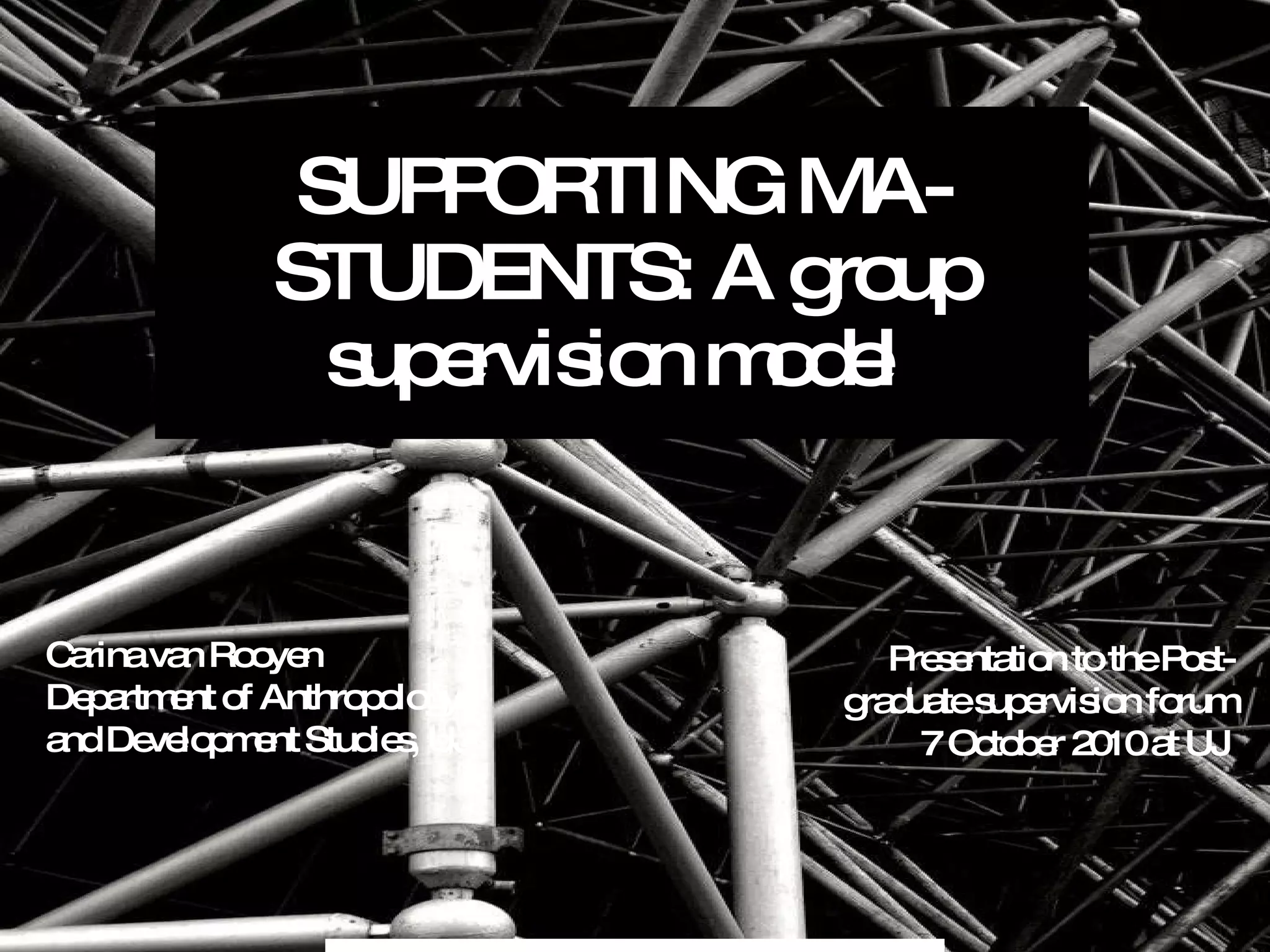 - The document discusses a group supervision model used for MA students at the University of Johannesburg where students from different stages of their degree jointly and individually meet with supervisors.