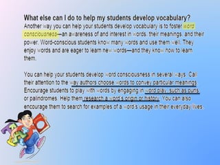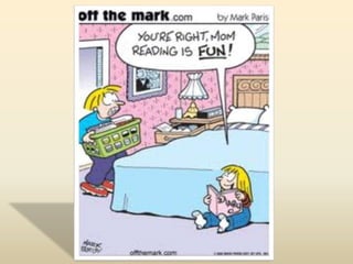 The document discusses the importance of fluency in reading. It defines fluency as the ability to read text quickly, smoothly and automatically with little focus on decoding individual words. Developing fluency requires automaticity in multiple areas including accuracy, expression, pacing and the ability to process language and punctuation simultaneously. The goal is for readers to sound natural when reading aloud without conscious attention to decoding.