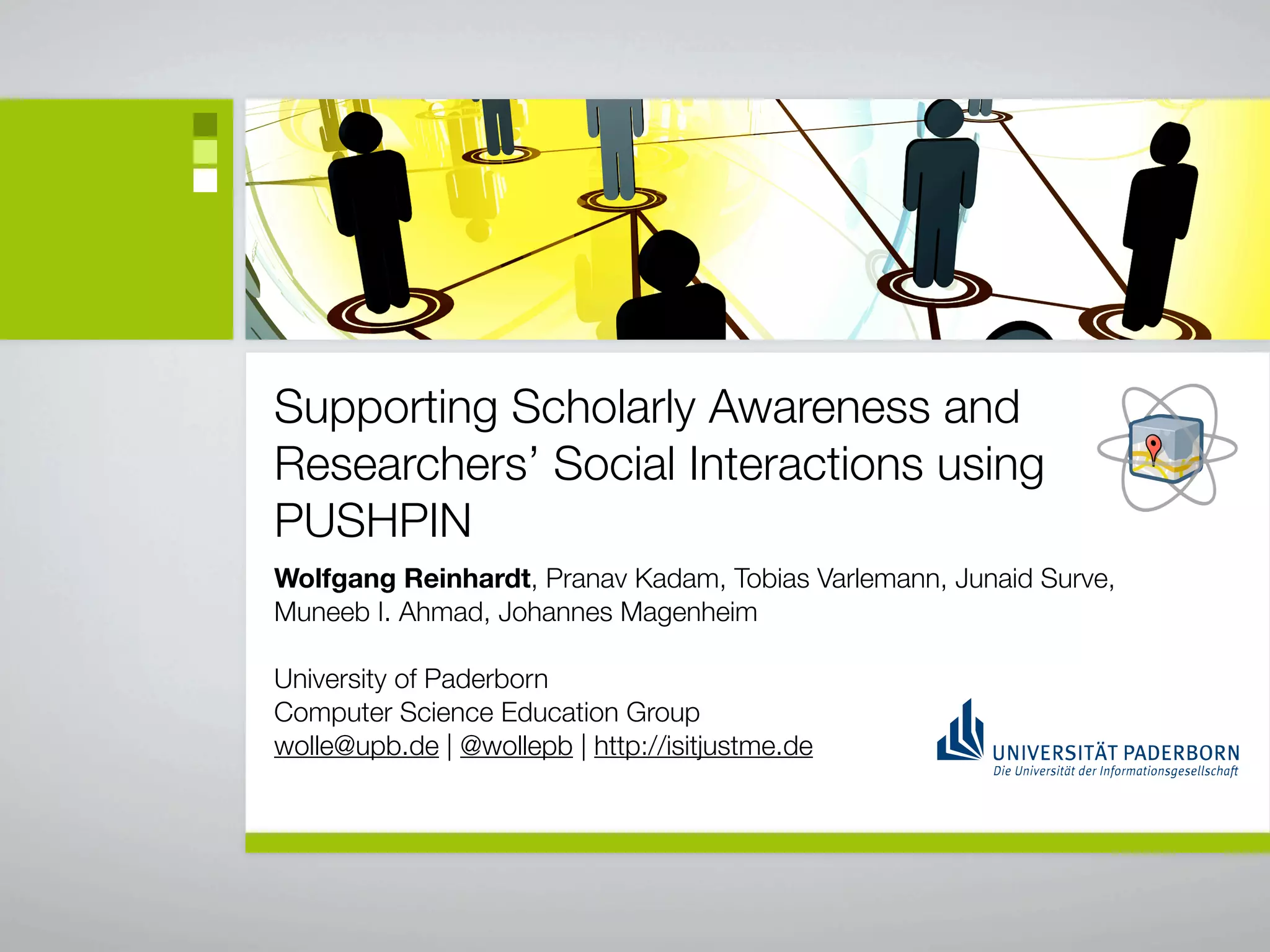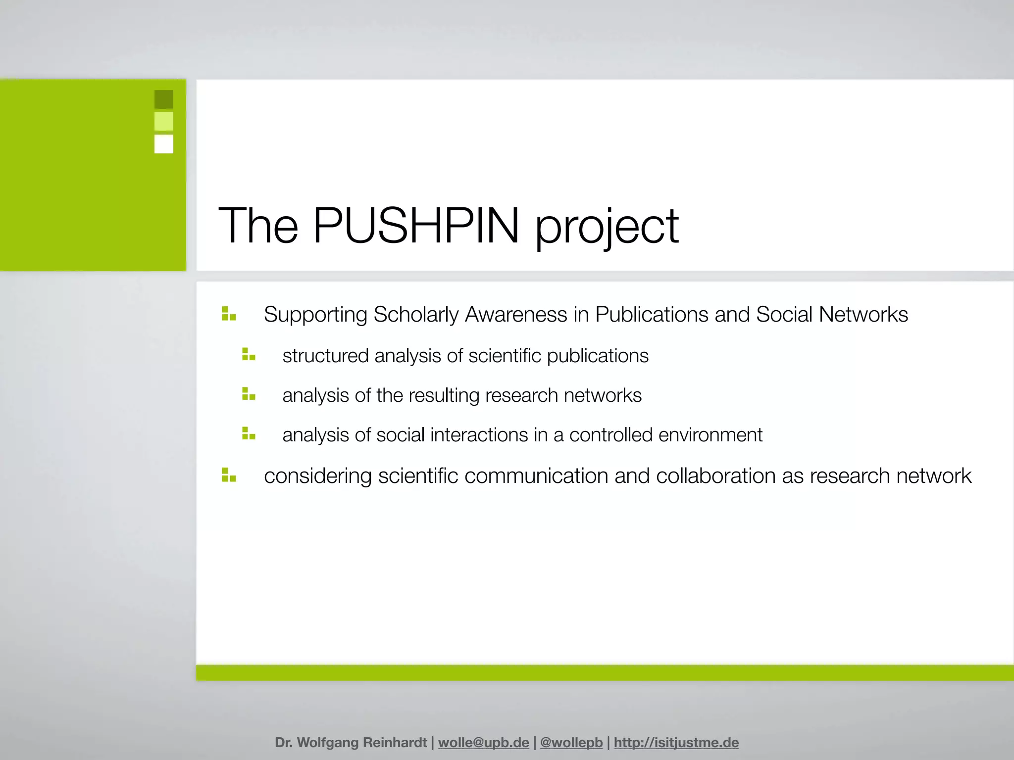The PUSHPIN project aims to support scholarly awareness and social interactions among researchers. It does this by analyzing scientific publications and the resulting research networks. The goals are to make researchers aware of their connections and provide recommendations of similar peers, publications, and research interests. The project has three interfaces - a web application, mobile application, and tabletop application - and is currently in alpha testing.