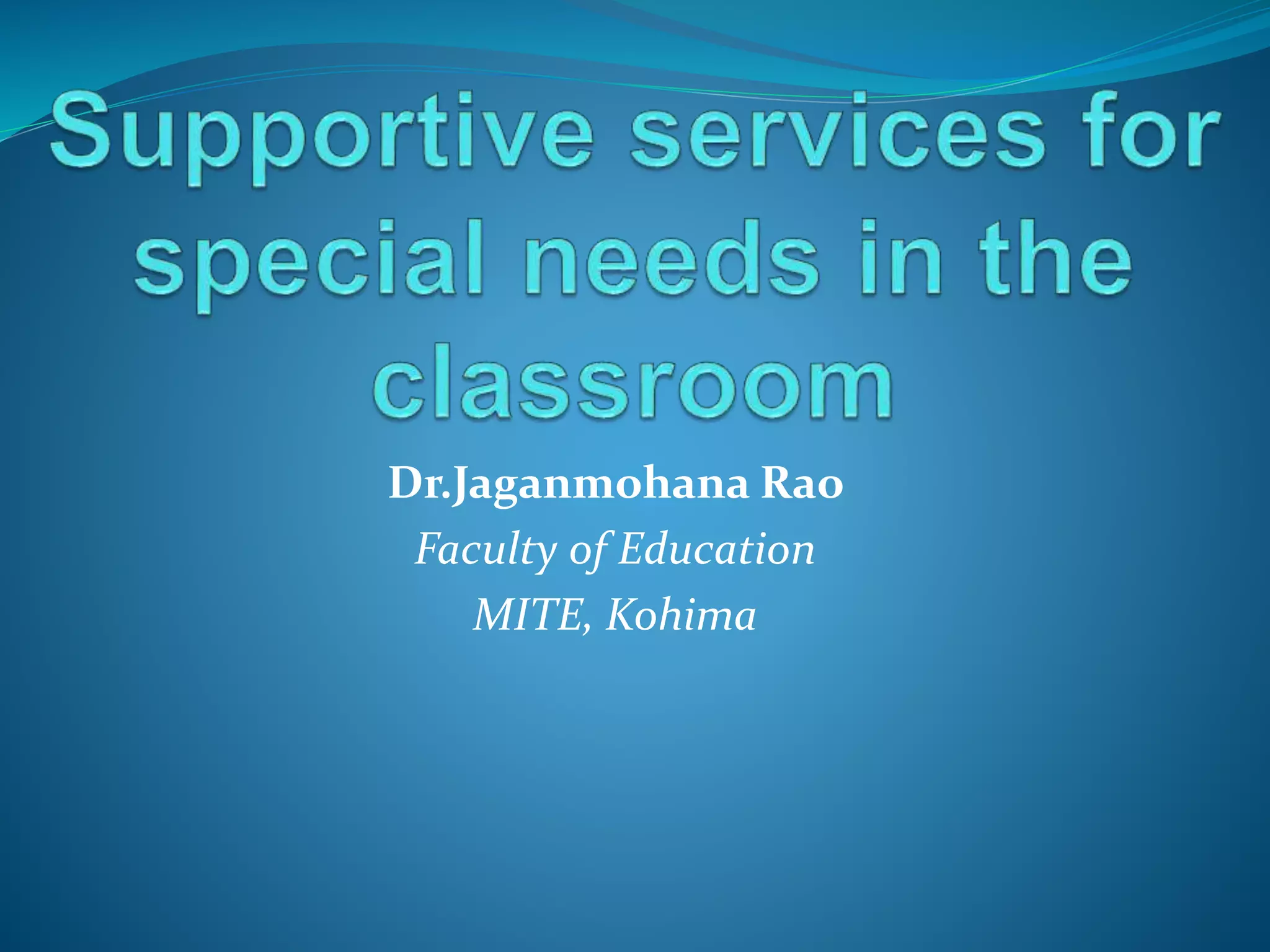 This document discusses supportive services for students with special needs in an inclusive classroom. It outlines the roles of special teachers, speech therapists, physiotherapists, occupational therapists, and counselors who provide different types of support. Special teachers help with lesson planning, specialized instruction, and classroom management. Speech therapists, physiotherapists, and occupational therapists provide specific services to address needs related to communication, physical abilities, and daily living skills. Counselors offer counseling and collaborate with other professionals.