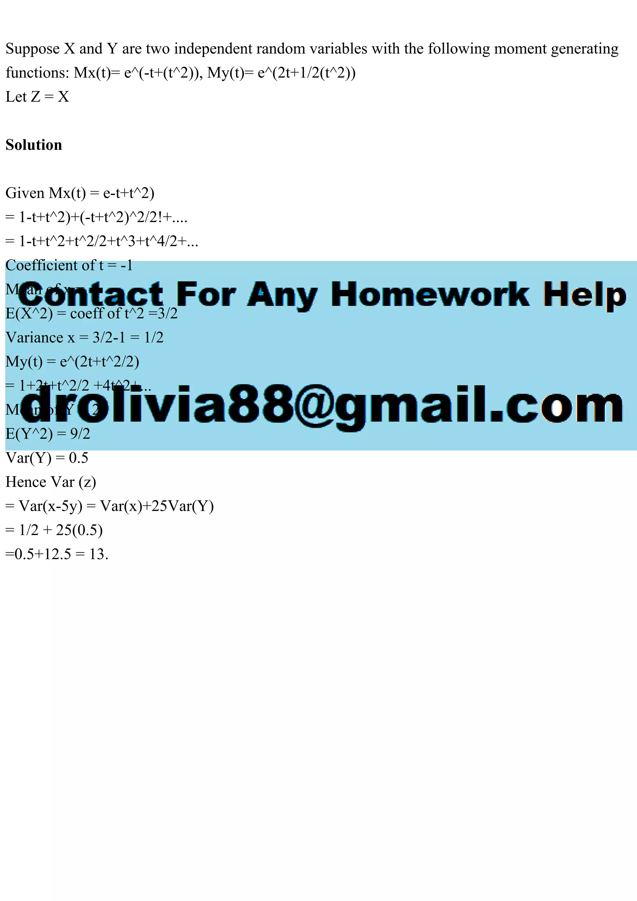The document analyzes two independent random variables, x and y, using their moment generating functions. It calculates the means, variances, and combines these to find the variance of a new variable z defined as z = x - 5y. The final variance of z is determined to be 13.