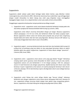 Suppositoria adalah sediaan padat yang diberikan melalui rektal, vagina, atau uretra. Ada beberapa jenis suppositoria berdasarkan lokasi pemberiannya, seperti suppositoria rektal, vaginal, dan uretra. Suppositoria digunakan untuk tujuan lokal maupun sistemik karena dapat diserap oleh membran mukosa. Bahan dasar yang umum digunakan adalah lemak cokelat, polietilen glikol, dan gelatin.