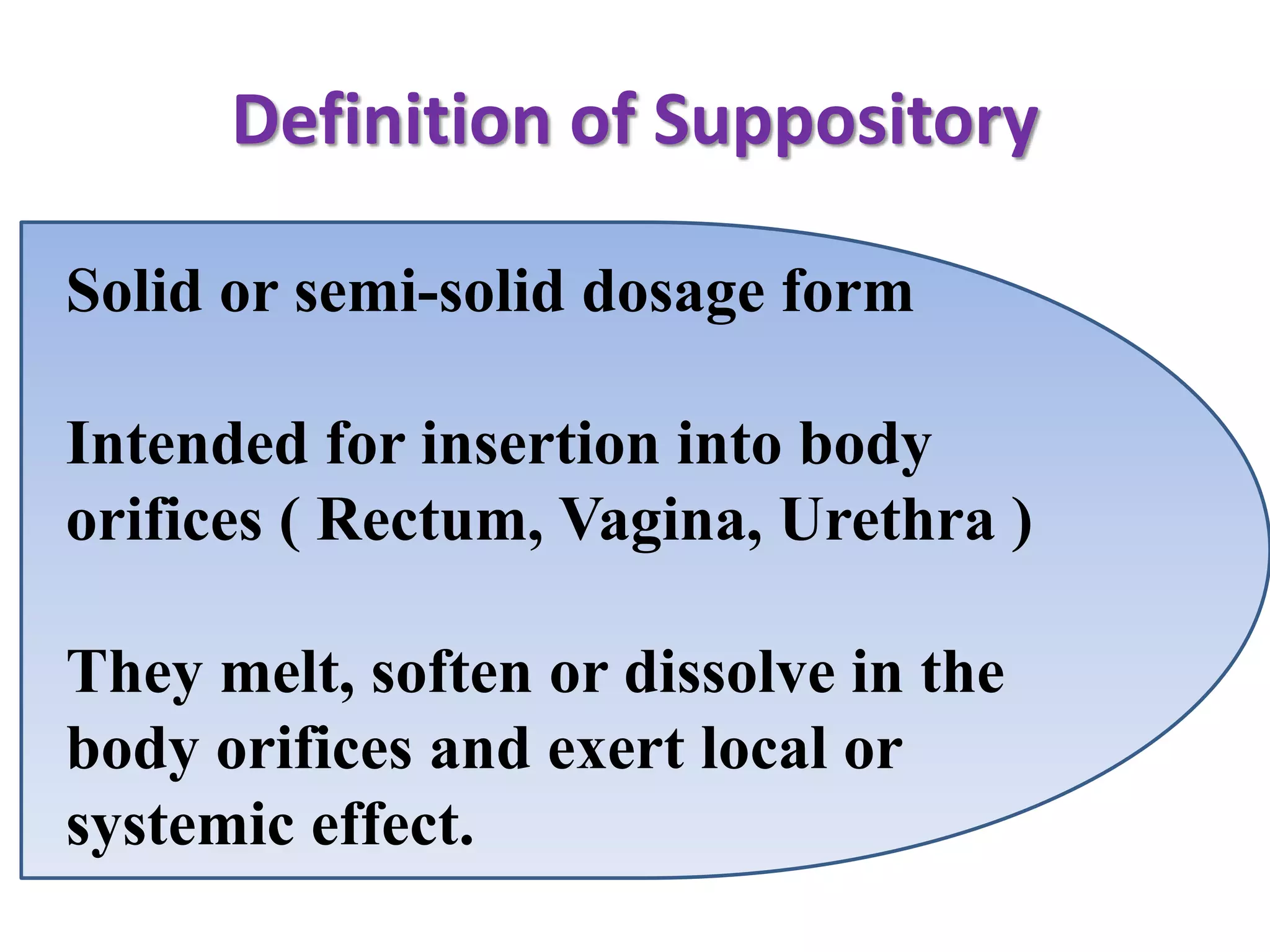This document defines suppositories as solid or semi-solid dosage forms intended for insertion into body orifices like the rectum, vagina, or urethra. Suppositories are classified by their route of administration and melt or dissolve in the body to exert local or systemic effects. Ideal suppository bases melt at body temperature, are non-toxic, compatible with drugs, and release drugs readily while being easy to handle and stable during storage and molding. The document discusses various suppository bases, preparation methods, packaging, and commercial products.