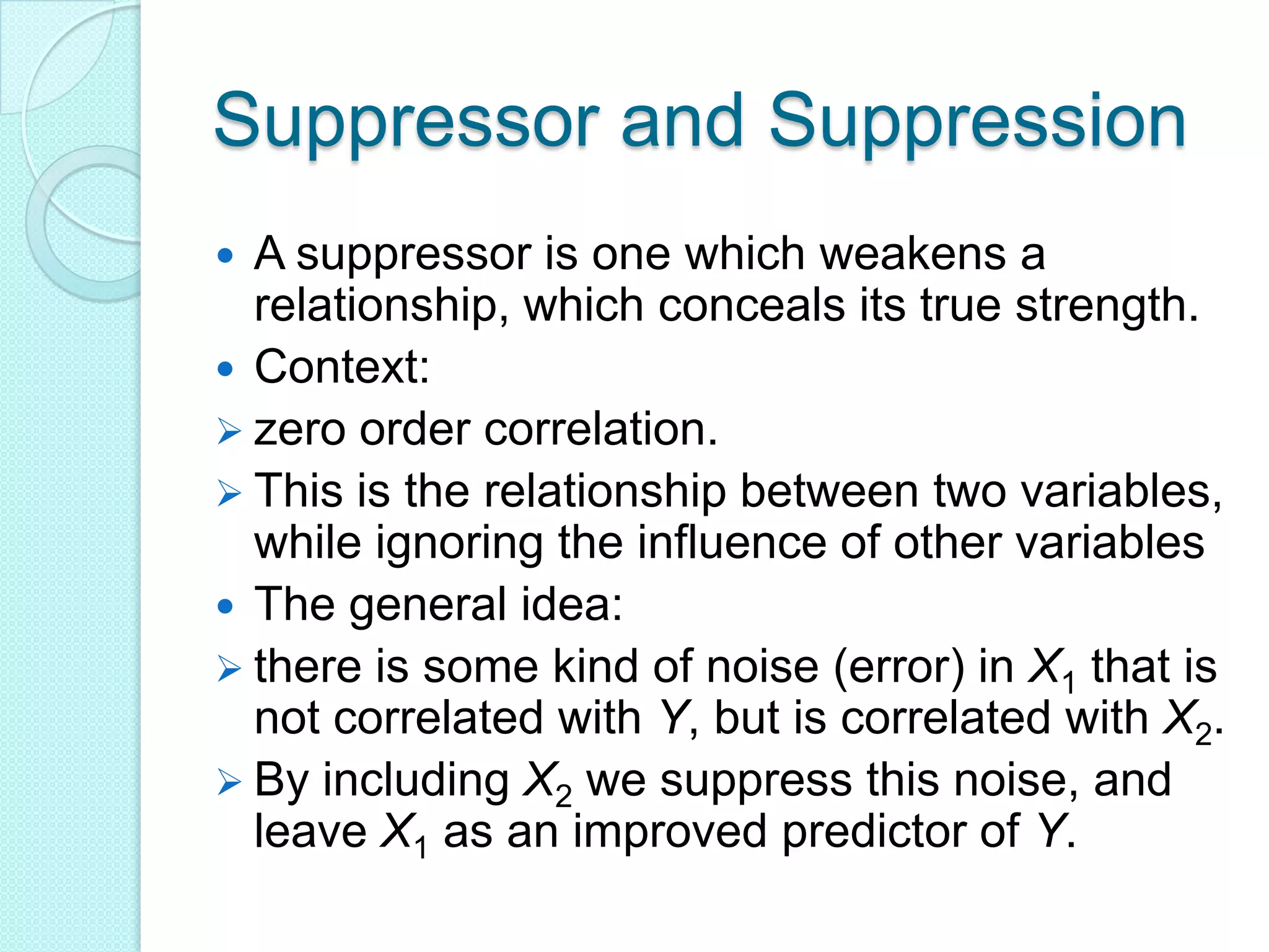 1. A suppressor variable is one that weakens the relationship between two other variables by suppressing error or noise in one of the variables.