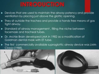 This document discusses supraglottic airway devices. It begins by introducing supraglottic airway devices as those that maintain airway patency by sitting above the glottic opening. It then classifies devices based on generation, sealing mechanism, number of lumens, and discusses indications, contraindications, advantages, and disadvantages of supraglottic airway devices. Specific devices like LMA Classic, Flexible LMA, Ambu Aura, Soft Seal LMA, and Intubating LMA are then described in more detail. Problems associated with devices and techniques to reduce aspiration are also covered.