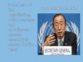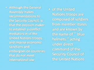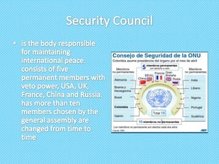 The United Nations is an intergovernmental organization formed in 1945 to promote international cooperation. It has 192 member states and is headquartered in New York. The UN aims to maintain peace and security, develop friendly relations among nations, and solve economic, social and humanitarian problems through international cooperation. It involves all member states in decision making through the UN General Assembly and other specialized agencies that work to harmonize actions and achieve common goals.