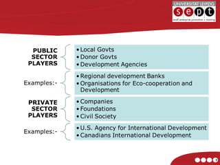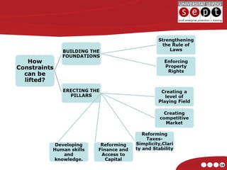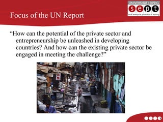 The UN report focuses on how to unleash the potential of the private sector and entrepreneurship in developing countries to help address deep poverty. It discusses various constraints facing entrepreneurs and small businesses, including lack of skills, access to capital, and an unstable macroeconomic environment. The report recommends governments strengthen the rule of law, create a level playing field for businesses, reform taxes and finance systems, and develop human skills to help build an enabling environment for businesses and entrepreneurship to thrive. Public-private partnerships are also emphasized as a way to engage businesses in sustainable development projects.