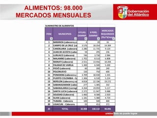 REQUERIMIENTOSAGUA POTABLE PARALOS ALBERGUES Y AREAS NO EVACUADASPLANTAS MOVILES PARA POTABILIZAR AGUASEGURIDAD Y ORDEN PUBLICOSERVICIOS PUBLICOSTRANSPORTE PARA EVACUACION: CAMIONES, LANCHASMAQUINARIA PESADA. MEDIDAS DE CONDONACIÓN DE DEUDAS A CAMPESINOS.PERSONAL MEDICO PERMANENTEUNIDADES MEDICAS MOVILESAMBULANCIASLANCHA AMBULANCIA