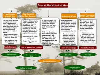 The document discusses the importance of reciting Soorat Al-Kahf based on three hadiths. It states that the Prophet Muhammad said anyone who memorizes the first 10 verses of Soorat Al-Kahf will be protected from the Dajjaal. It also mentions that reciting the last 10 verses of the soorah will prevent the Dajjaal from having power over someone. The document then provides a brief overview of the stories and lessons contained in Soorat Al-Kahf. It emphasizes the importance of reading this soorah every Friday and following its teachings in order to understand life's trials and be saved from fitnah and the Dajjaal.