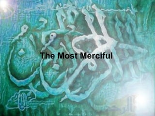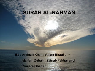 The document summarizes the key themes and descriptions from Surah Ar-Rahman in the Quran. It describes God as the Most Merciful who taught mankind speech, created humans from clay and jinns from fire. It discusses the creation of the heavens, earth, seas, mountains and other natural phenomena. It contrasts the rewards of paradise for the righteous with the punishment of hell for criminals and non-believers. The summary concludes by praising God as the Possessor of Majesty and Generosity.