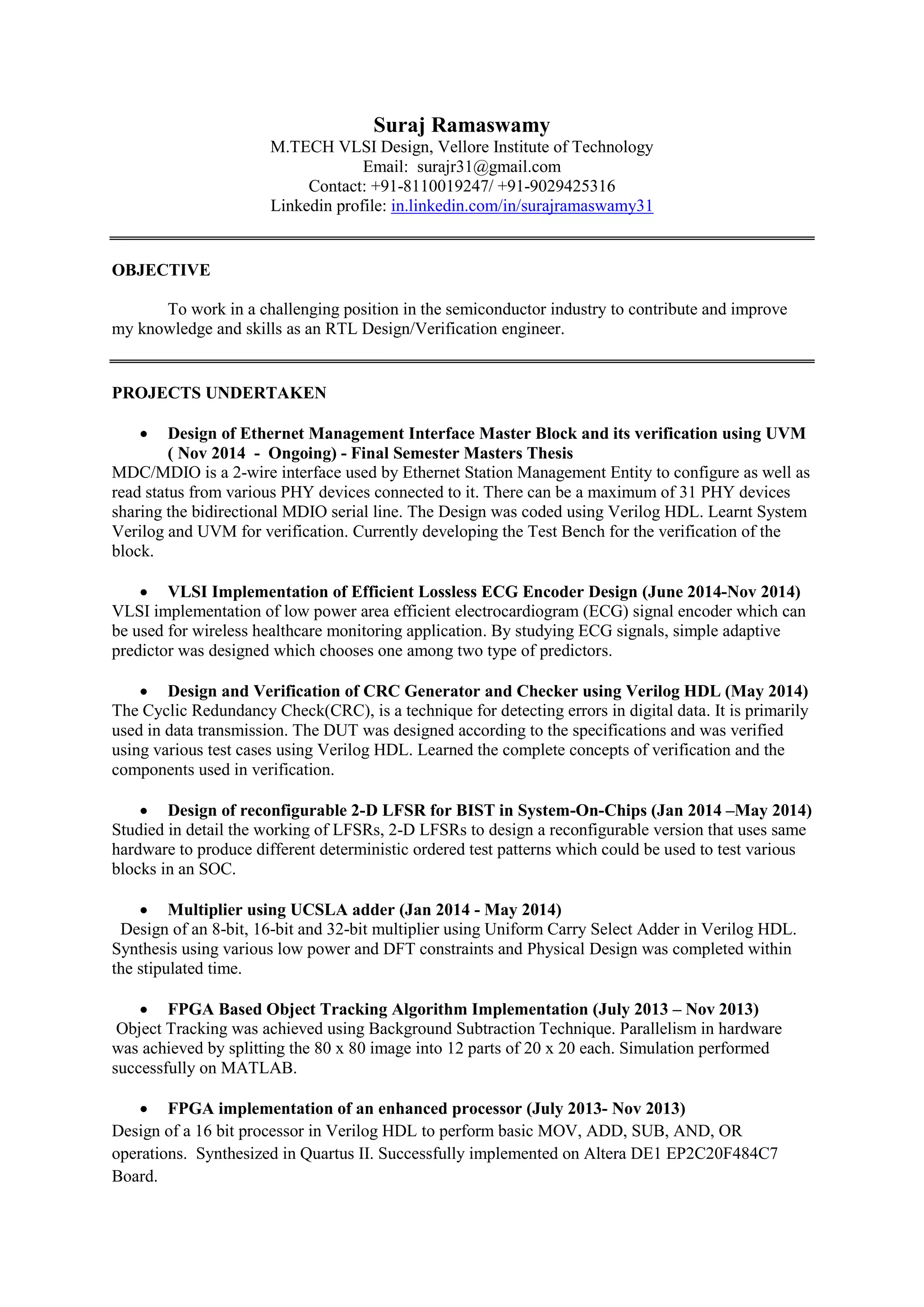 Suraj Ramaswamy is seeking a position in the semiconductor industry as an RTL Design/Verification engineer. He has a M.Tech in VLSI Design from Vellore Institute of Technology and has experience with projects involving Ethernet interface design and verification using UVM, ECG encoder design for healthcare applications, CRC generator/checker design and verification, reconfigurable LFSR design for BIST, and FPGA implementation of a basic processor and object tracking algorithm. His technical skills include Verilog, SystemVerilog, UVM, C, Java, MATLAB, and CAD tools from Cadence and Altera.