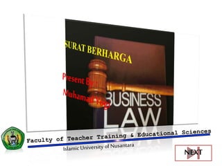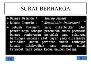 Dokumen ini menjelaskan berbagai jenis surat berharga, termasuk wesel, cek, bilyet giro, promes, dan obligasi, serta fungsi dan syarat-syarat formal yang menyertainya. Terdapat penjelasan tentang peran dan kewajiban pihak-pihak terkait dalam penerbitan dan pembayaran surat berharga tersebut. Juga diuraikan tentang surat berharga di pasar modal dan pasar uang yang memiliki karakteristik dan jangka waktu berbeda.
