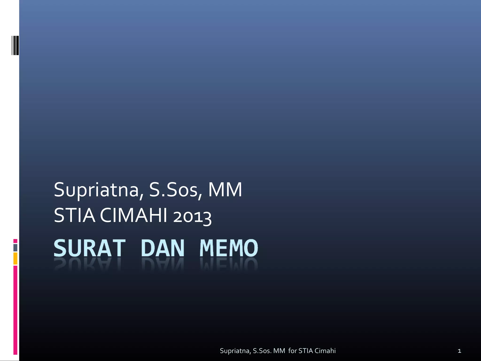 Dokumen ini membahas keterampilan menulis surat dan memo bisnis yang efektif, termasuk format, bagian-bagian yang harus ada, dan alasan penulisan. Surat bisnis harus mengikuti gaya penulisan tertentu dan mencakup informasi yang jelas dan sopan. Memo digunakan untuk komunikasi internal dan bersifat lebih informal dibandingkan surat, tetapi memiliki kelebihan dan kelemahan dalam penyampaian pesan.