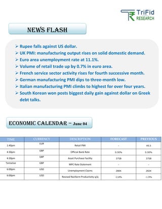 The document provides a daily economic calendar and forecasts for June 4th. It lists upcoming data releases for the euro, British pound, and US dollar on retail PMI, bank rates, asset purchases, rate statements, and unemployment claims. Brief international economic news is also provided, including the rupee falling against the dollar and UK and euro area manufacturing activity and unemployment. Technical support and resistance levels are given for various currency pairs.