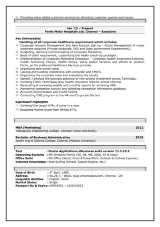 This document is a resume for Suresh B summarizing his professional experience and qualifications. He has 3 years of experience in corporate sales, marketing, and customer relationship management. Currently he works as an Executive at Fortis Malar Hospitals Ltd in Chennai handling corporate accounts, marketing strategies, and business development. He has an MBA in Marketing and a Bachelor's degree in Business Administration. His skills include sales, marketing, client relationship management, and data analysis.