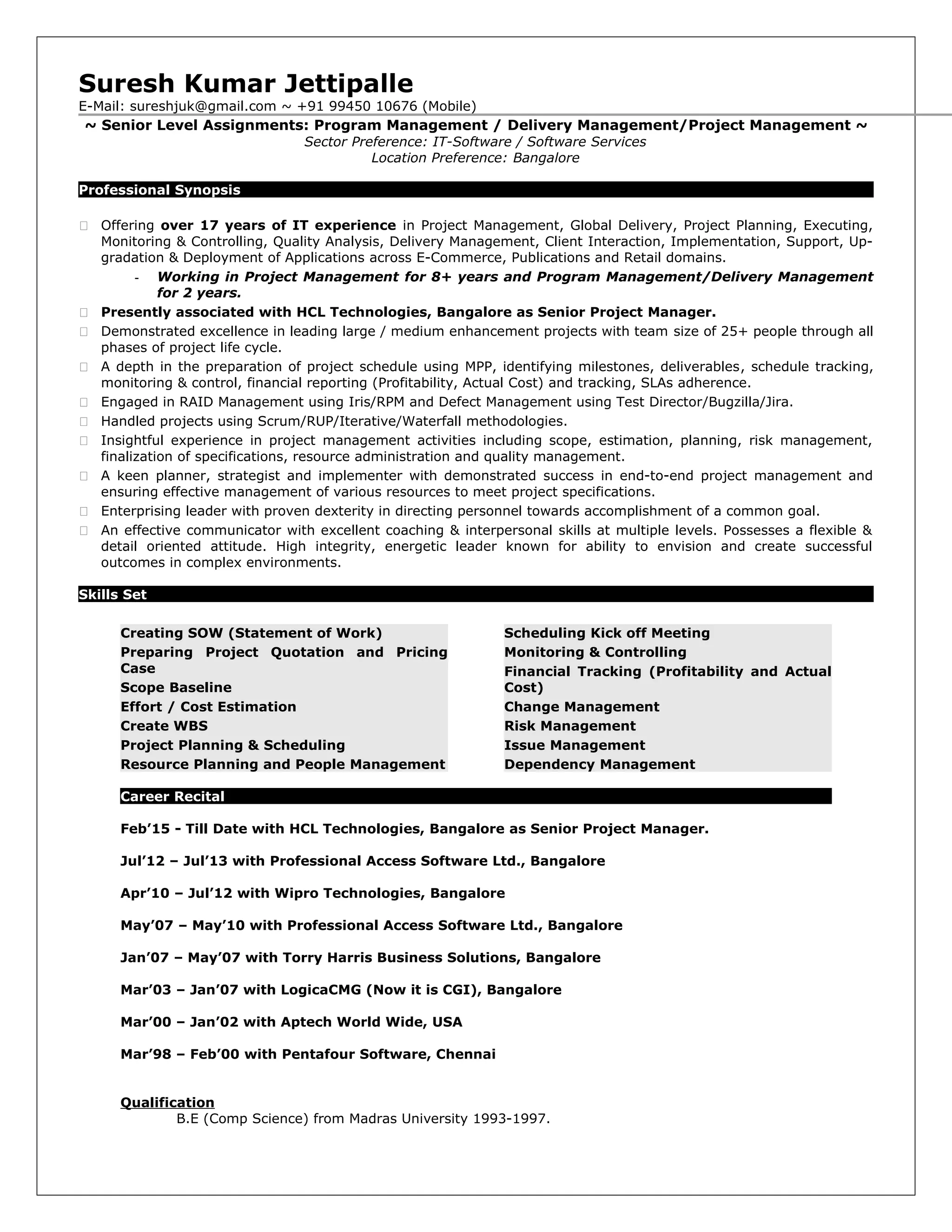 Suresh Kumar Jettipalle has over 17 years of IT experience, primarily in project and delivery management across various sectors including e-commerce and retail. Currently a senior project manager at HCL Technologies in Bangalore, he has successfully led multiple projects, demonstrating expertise in project scheduling, resource management, and agile methodologies. His career includes notable achievements such as managing multimillion-dollar projects and receiving accolades for project delivery and client satisfaction.
