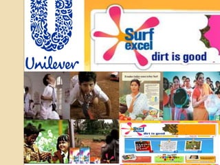 This document provides a marketing presentation on the detergent brand Surf Excel. It discusses Surf Excel's history in India since 1954, its product range targeting different markets, and marketing strategies like promotional advertisements transitioning from rational to emotional appeals. Competitors include Aerial and P&G. Observations note Surf Excel as an experienced player with innovative ads and strong distribution. Suggestions include reducing price and ad expenses while expanding rural penetration.