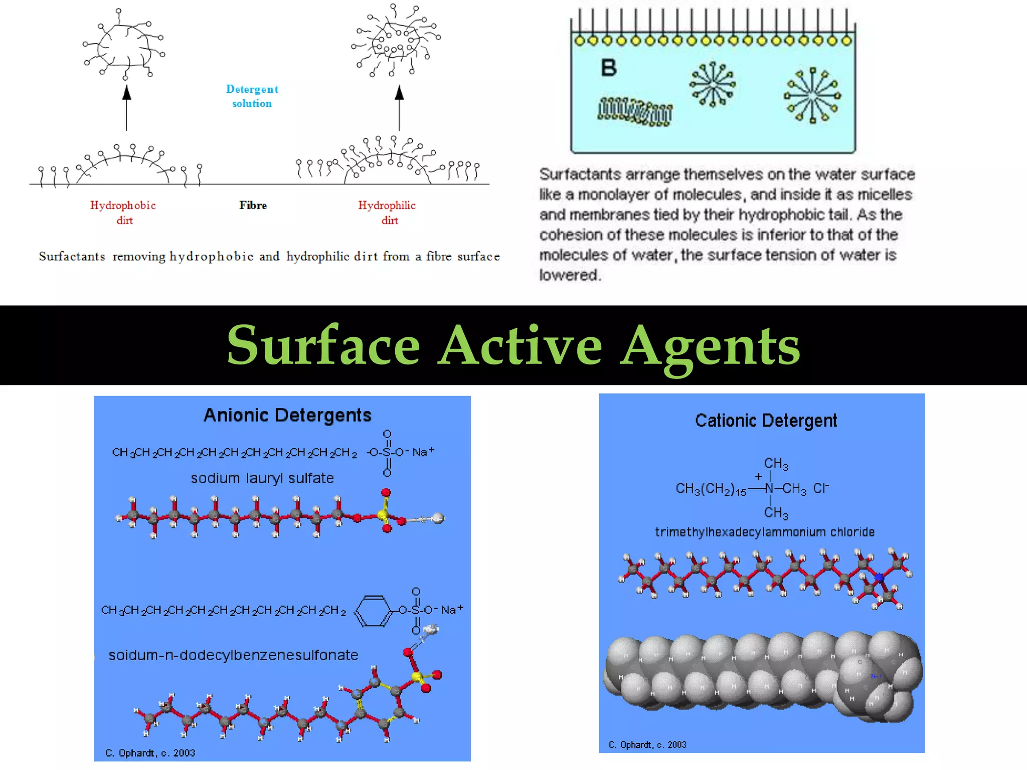 The document discusses surface active agents, also known as surfactants. Surfactants are amphiphilic organic compounds that contain both hydrophobic and hydrophilic groups. When added to a liquid, surfactants reduce surface tension and increase spreading and wetting properties. In textile dyeing, surfactants help dye penetrate fabric evenly. Surfactants have various applications including detergents, fabric softeners, emulsifiers, paints, adhesives, and more. Detergents are classified as ionic (anionic, cationic, amphoteric) or nonionic. Anionic detergents contain negative ions like alkyl sulfates or alkyl benzene sulfonates. Cationic deterg