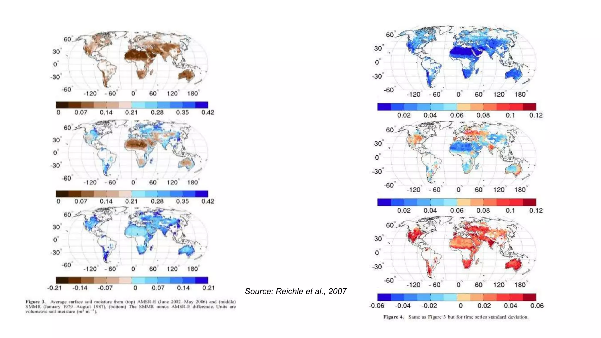 2) Another evaluates global soil moisture from the ERS scatterometer and AMSR-E, finding general agreement except in deserts and dense vegetation due to limitations.