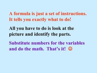 2) It explains how to identify the key dimensions needed to substitute into the formulas, like finding the radius, diameter, height, and base/length of an object.