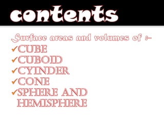 2. It provides the formulas to calculate the surface area and volume of each shape. For cubes, cuboids, cylinders and cones it gives the formulas for total surface area. For spheres and hemispheres it provides the formulas for total surface area, curved surface area, and volume.
