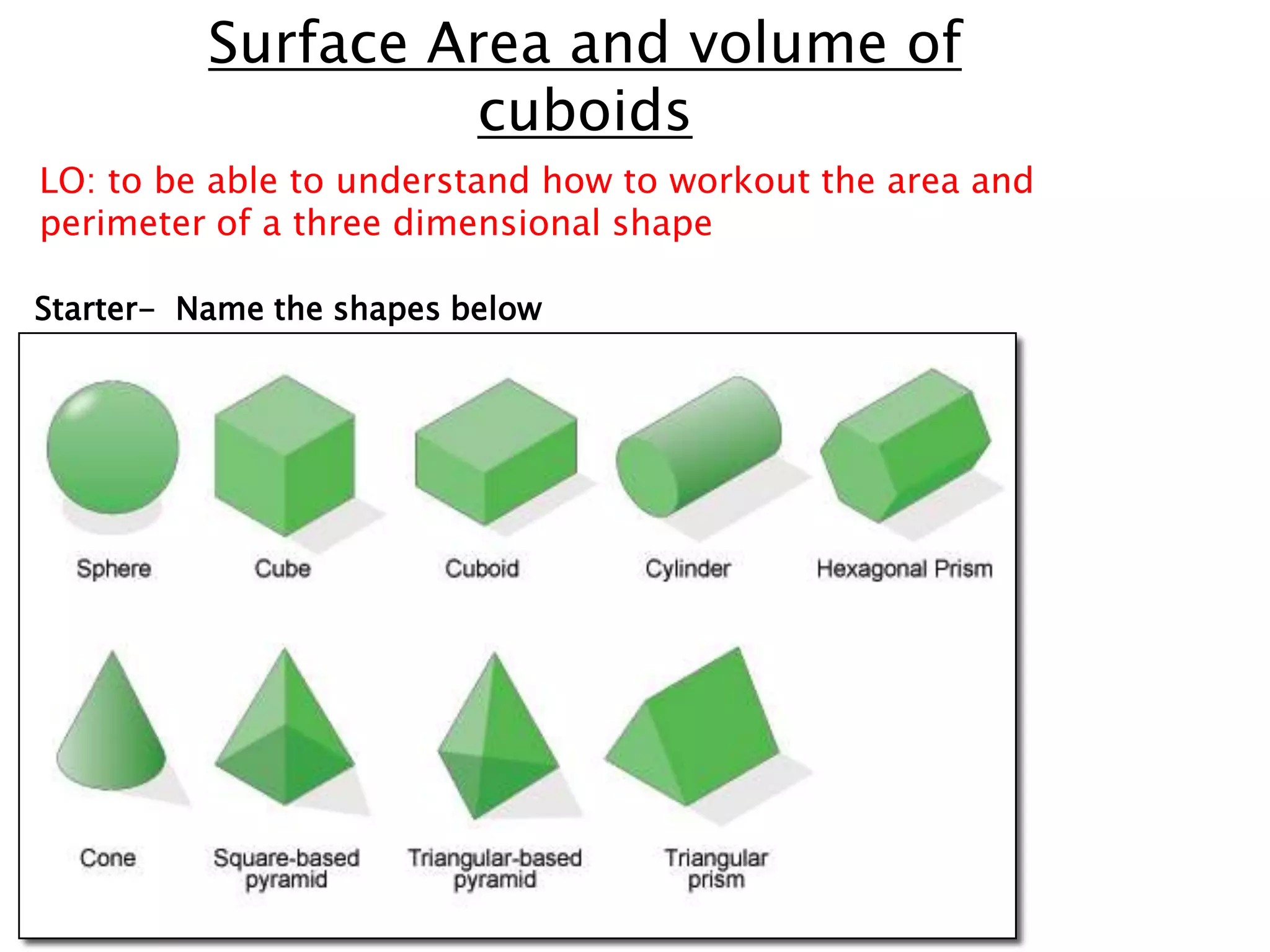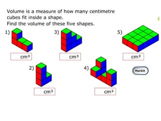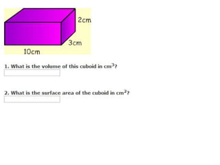 This document discusses calculating the surface area and volume of cuboids. It provides the formulas for finding the volume and surface area of a cuboid: