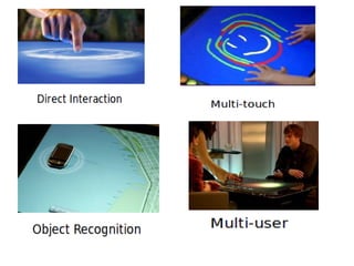 The document discusses Surface Computer, a multi-touch product from Microsoft that allows multiple users to interact with a 30-inch tabletop display using touch and gestures instead of a mouse or keyboard. It recognizes touch inputs, objects placed on its surface, and can be used collaboratively. The Surface uses infrared cameras beneath the screen to sense touch and objects, processes the information, and displays it using rear projection. It is currently used commercially but Microsoft hopes to expand it to consumers by making home versions that could use other surfaces.