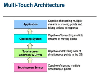 The document discusses surface computing and multitouch technology, highlighting its evolution from traditional mouse-and-keyboard interfaces to a more natural user interface. It details the development of Microsoft's interactive tabletop device, emphasizing its ability to recognize touch and gestures through various sensing technologies. The text underlines the importance of natural interaction with digital content and the potential future of such technological innovations.