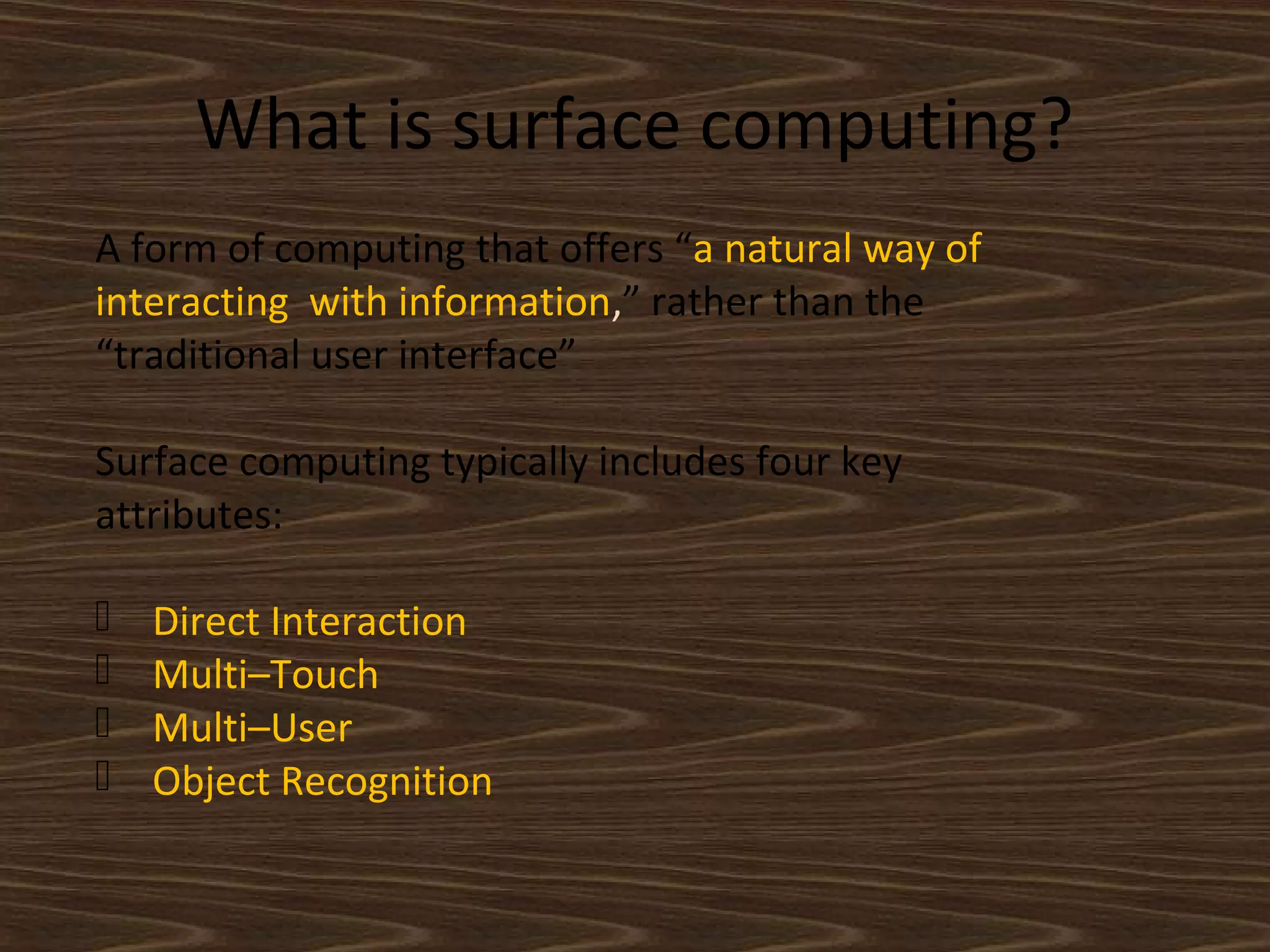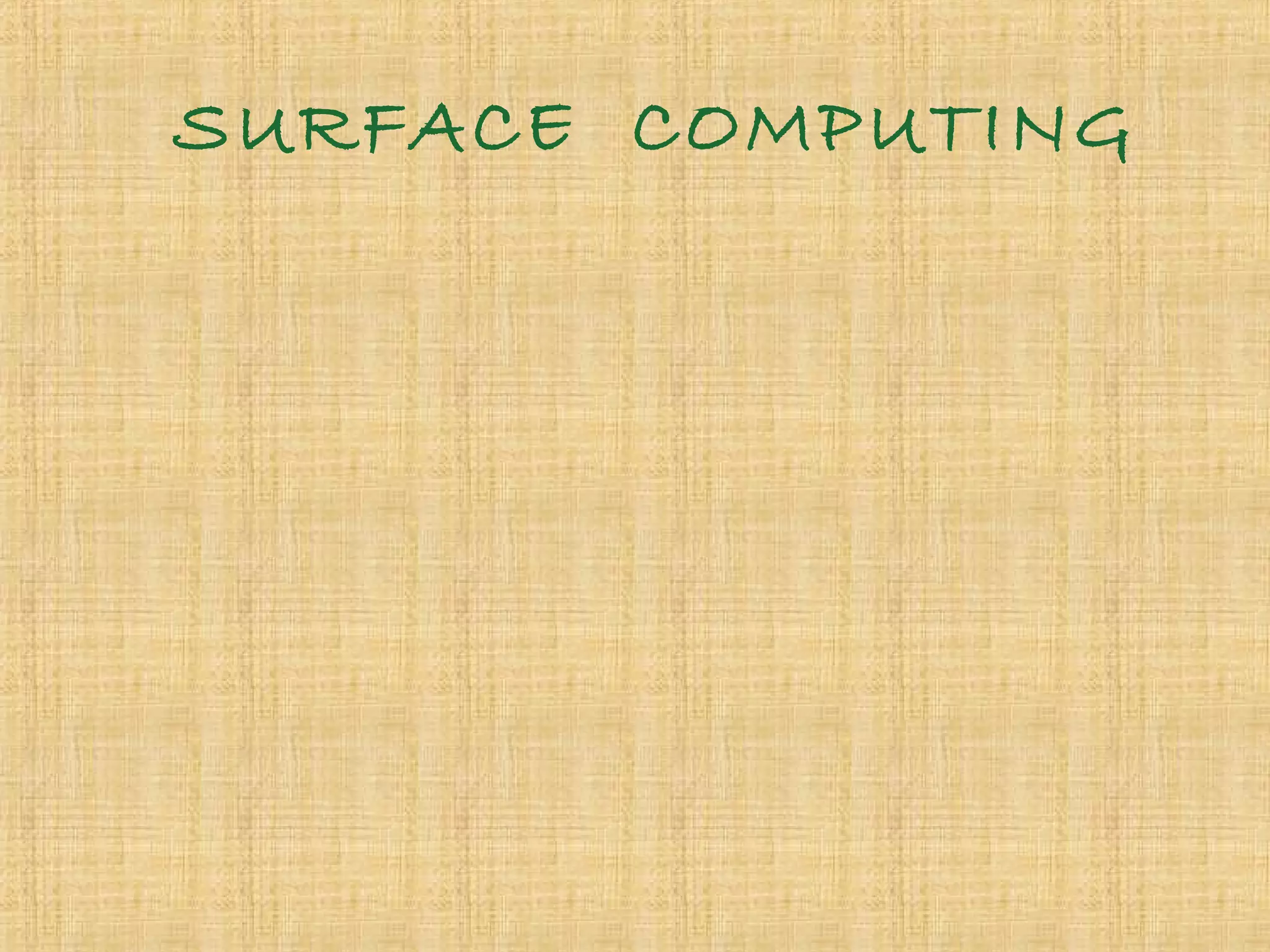 Surface computing allows for natural interactions with digital information through direct touch interaction, multi-touch detection, support for multiple simultaneous users, and object recognition. It utilizes technologies like Microsoft Surface, which uses infrared cameras under the display to sense touch input and objects placed on the screen without needing a touch-sensitive surface. Surface computing provides an intuitive interface and has applications in fields like education, retail, and business meetings.