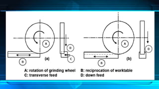 This document describes the components and working of a surface grinding machine. It discusses the principle, types including horizontal and vertical spindle machines, working, and equipment. The key components are the grinding wheel, workholding chuck, and reciprocating or rotary table. The wheel rotates to grind the flat surface of a workpiece held securely in the chuck. Factors like material and wheel selection influence the process. Precision grinding provides smooth, flat surfaces for functional purposes.