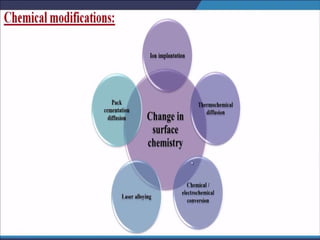 This document discusses surface modification techniques. It introduces surface modification and lists some of its purposes like enhancing anticorrosive and adhesion properties. It presents a modern classification of surface modification and discusses some technical resources for surface modification like plasma treatment and corona discharge. Plasma treatment can be used for micro cleaning, functionalization, and establishing hydrophobic and hydrophilic properties. Corona discharge modifies surfaces to provide longer lifespan, improve bonding and corrosion resistance. It also lists some commercial corona plasma equipment manufacturers and provides references.