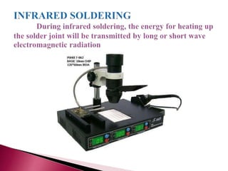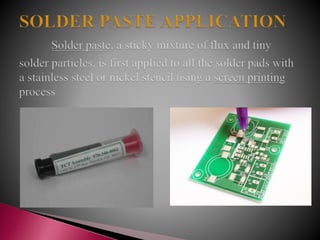 Surface mount technology involves attaching electronic components directly to the surface of printed circuit boards, as opposed to through-hole technology where components are inserted into holes. There are three main types of surface mount assemblies depending on whether components are mounted on one or both sides of the board. The surface mount process involves designing the board, applying solder paste, placing components, soldering, cleaning, and potential repair. Infrared and hot gas soldering are two common soldering techniques used. Reworking involves removing faulty components and soldering new ones in their place.