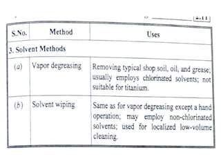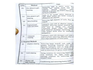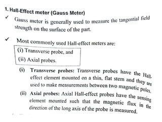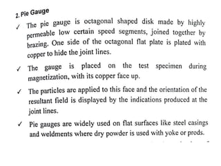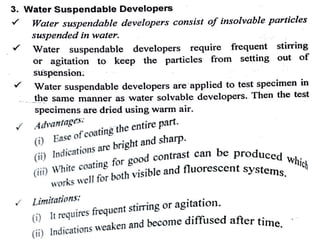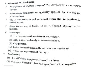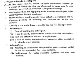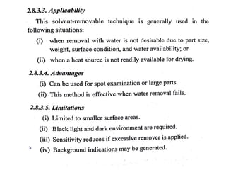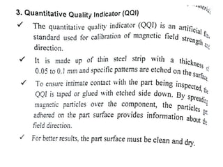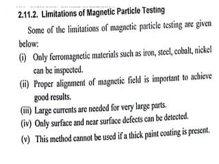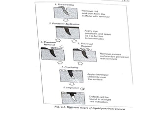 The document discusses two non-destructive testing methods: liquid penetrant testing and magnetic particle testing. Liquid penetrant testing uses liquid that is drawn into surface cracks by capillarity, then a developer reveals the flaws. The process involves surface cleaning, penetrant application, dwell time, developer application and inspection. Magnetic particle testing uses magnetism to detect subsurface flaws in ferromagnetic materials. Iron particles are attracted to cracks when the part is magnetized. The process involves demagnetization, magnetization, particle application and inspection under lighting. Both are widely used to inspect parts for cracks and defects.