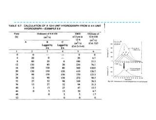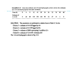 This document discusses surface runoff, stream flow, hydrographs, and unit hydrographs. It begins by defining surface runoff and stream flow, explaining that surface runoff occurs when precipitation is unable to infiltrate the ground and flows overland into streams, rivers, and other bodies of water. It then discusses measuring stream flow through various methods like current meters and weirs to determine discharge. The document introduces the concept of hydrographs, which plot discharge over time, and unit hydrographs, which represent the hydrograph resulting from 1 unit of excess precipitation. It provides examples of using unit hydrographs and the S-curve method to develop hydrographs of different durations.