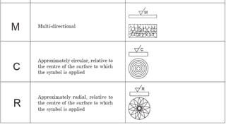 This document discusses measurement of surface finish. It begins with basic concepts of surface roughness and factors that influence surface finish like machining variables, tool geometry, workpiece and tool materials. It describes different types of surface irregularities from first to fourth order. There are two main methods to measure surface finish - qualitative methods like visual inspection and quantitative methods using instruments like stylus profilometers. Key parameters to analyze surface roughness include Ra, Rz, and RMS. Surface roughness is important for functions like friction, wear and lubrication.