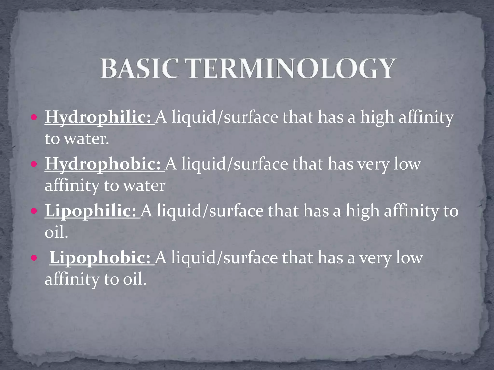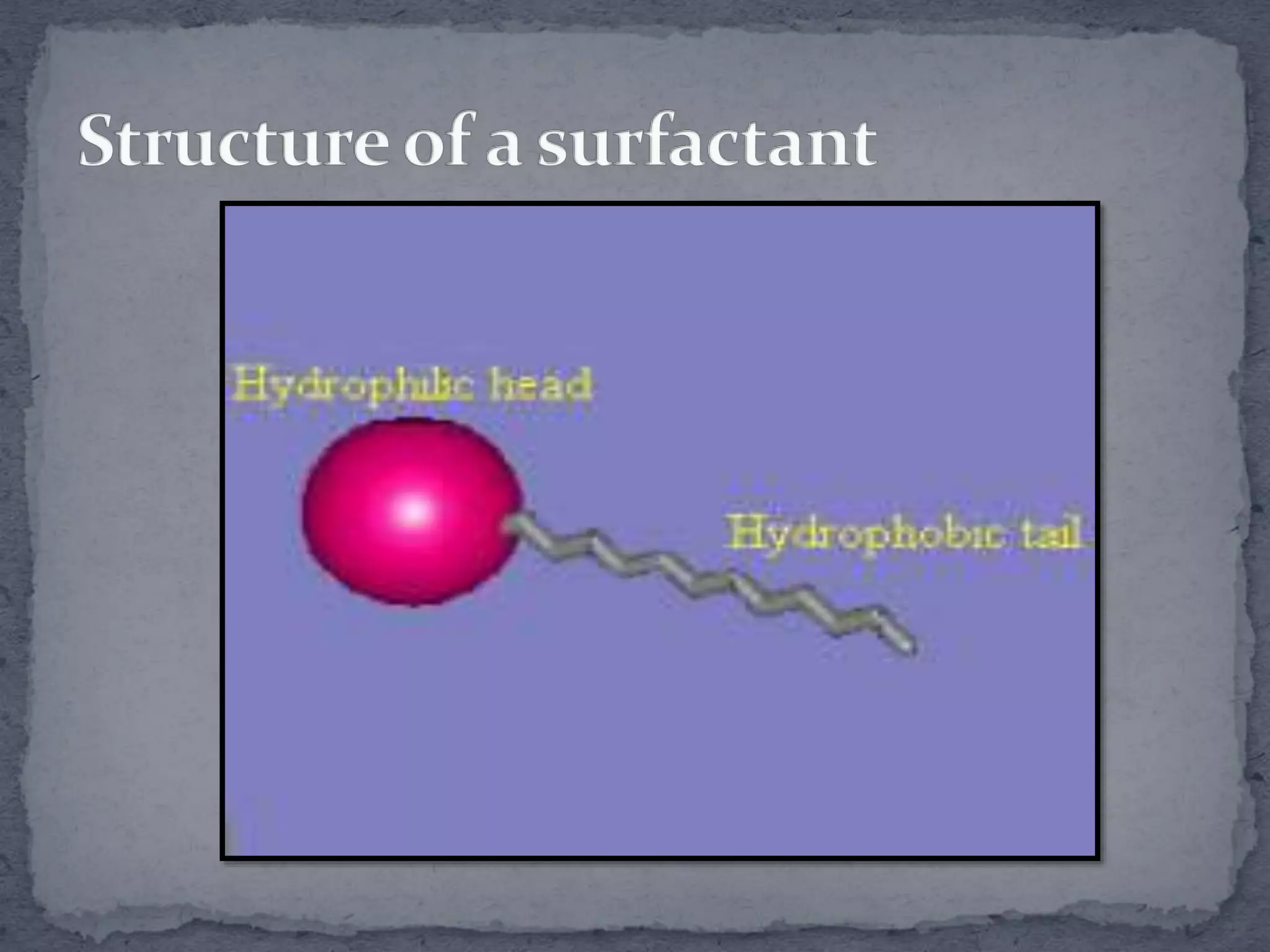 The document discusses surfactants and micelles. It defines hydrophilic, hydrophobic, lipophilic and lipophobic surfaces or liquids. It explains that surfactants are amphipathic molecules with both polar and nonpolar portions that can interact with both polar and nonpolar substances. Surfactants form spherical clusters called micelles in water, with nonpolar tails inside and polar heads outside. The document classifies common types of surfactants and discusses their uses.