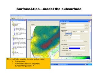 SurfaceAtlas is software that can model any surface or subsurface using three methods: triangulation, inverse distance weighted interpolation, or surface fitting of varying polynomial orders. It allows users to visualize subsurface structures in 3D and better understand the evolution of the Earth over time. The software was created by Guimin Geophysical.