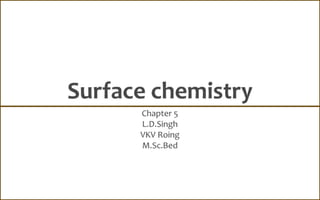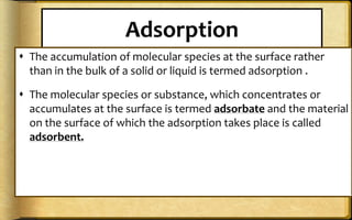 The document discusses adsorption, which is the accumulation of molecular species at the surface of a solid or liquid rather than in the bulk. The substance accumulating at the surface is called the adsorbate, and the material it accumulates on is the adsorbent. Adsorption can occur with gases accumulating on charcoal, dyes on animal charcoal, or water molecules on silica gel. It is influenced by factors like temperature, pressure, surface area, and the strength of interaction between adsorbate and adsorbent molecules. There are two main types - physical adsorption due to weak van der Waals forces, and chemical adsorption where chemical bonds form. Adsorption finds applications in areas